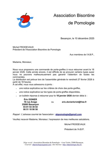 Dans le cadre de l'aménagement du verger pédagogique, J'étais le référent à l'Association Bisontine de Pomologie (ABP), à laquelle la mairie de Geneuille a dû adhérer .